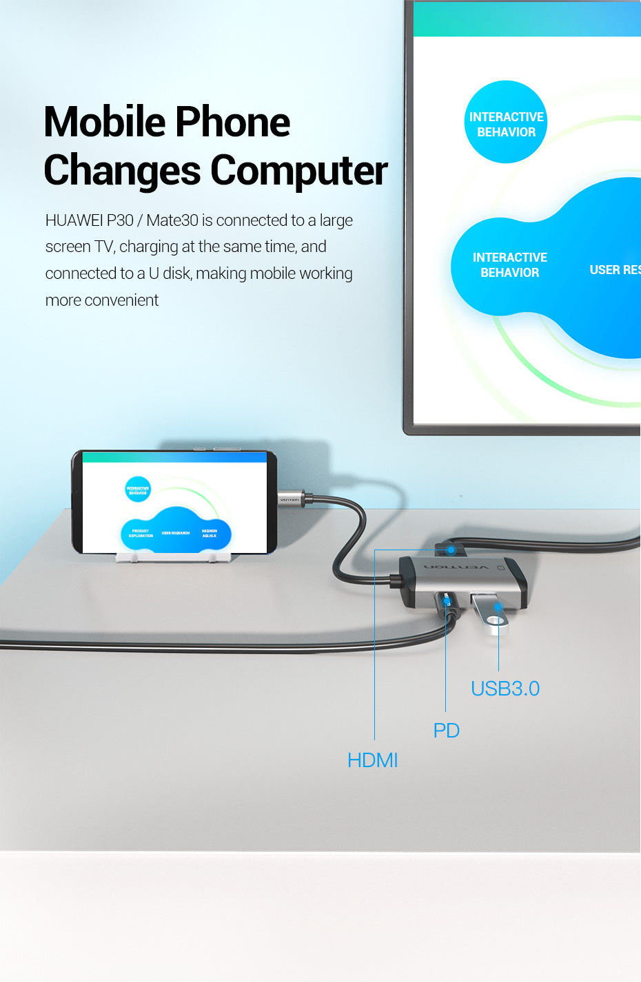 HUAWEI P30 / Mate30 est connecté à un téléviseur grand écran, se chargeant en même temps et connecté à un disque U, ce qui rend le travail mobile plus pratique